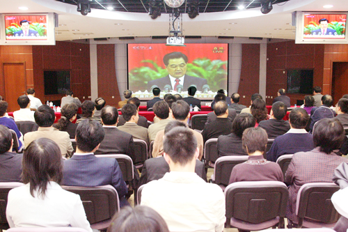 雖然因?yàn)槿藛T太多而略顯擁擠,但整個(gè)會場卻非常安靜,就連每逢會議難免嗡嗡作響的手機(jī)似乎也絕了聲。大家都在認(rèn)真地傾聽,有的詳細(xì)地做著記錄,有的還時(shí)不時(shí)地將身子輕輕探起,生怕錯(cuò)過電視里傳出的只言片語……10月15日上午,中核集團(tuán)公司黨組成員、副總經(jīng)理孫又奇,黨組成員王森,以及老領(lǐng)導(dǎo)趙宏、李忠良、錢福源等與集團(tuán)公司總部、檔案館、金原鈾業(yè)公司、新聞宣傳中心、二二一局的干部職工一起收看了中共十七大開幕式的現(xiàn)場直播,聆聽了胡錦濤總書記所作的報(bào)告。